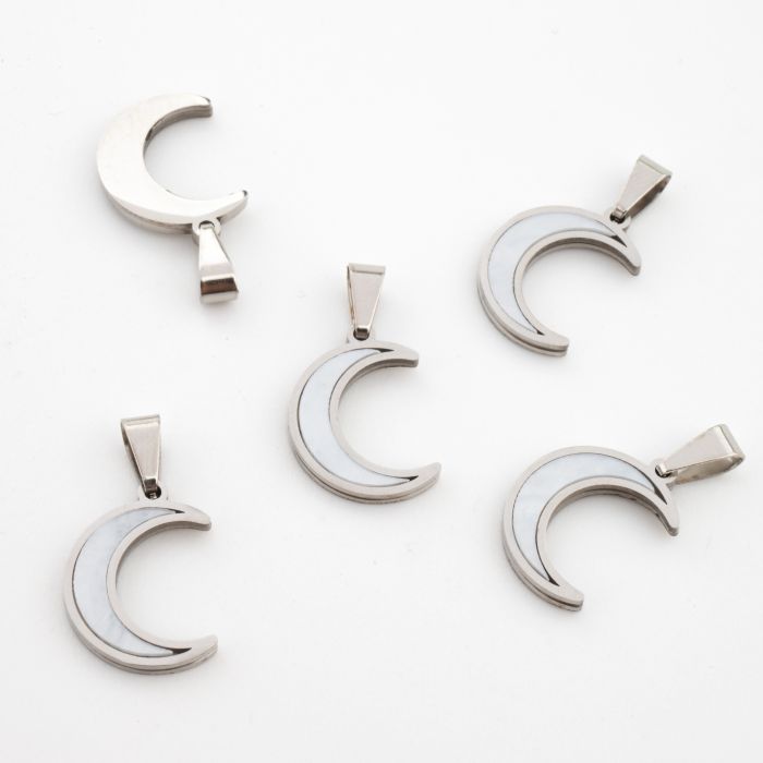Zawieszka ze stali chirurgicznej księżyc z masą perłową w kolorze srebrnym 18x13mm