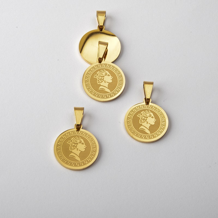 Zawieszka ze stali szlachetnej moneta w kolorze złotym 15mmTo starannie wykonany produkt ze stali szlachetnej, który dobrze prezentuje się w codziennym użytkowaniu. W biżuterii handmade stal szlachetna jest ceniona za dobry wygląd, odporność na korozję i wygodę codziennego użytkowania.Stal szlachetna to materiał ceniony za trwałość i estetyczny wygląd w codziennym użytkowaniu.W tym produkcie zastosowano stal szlachetną