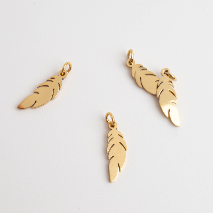 Zawieszka ze stali szlachetnej piórko w kolorze złotym 13,5mmTo starannie wykonany produkt ze stali szlachetnej, który dobrze prezentuje się w codziennym użytkowaniu. W biżuterii handmade stal szlachetna jest ceniona za dobry wygląd, odporność na korozję i wygodę codziennego użytkowania.Stal szlachetna to materiał ceniony za trwałość i estetyczny wygląd w codziennym użytkowaniu.W tym produkcie zastosowano stal szlachetną