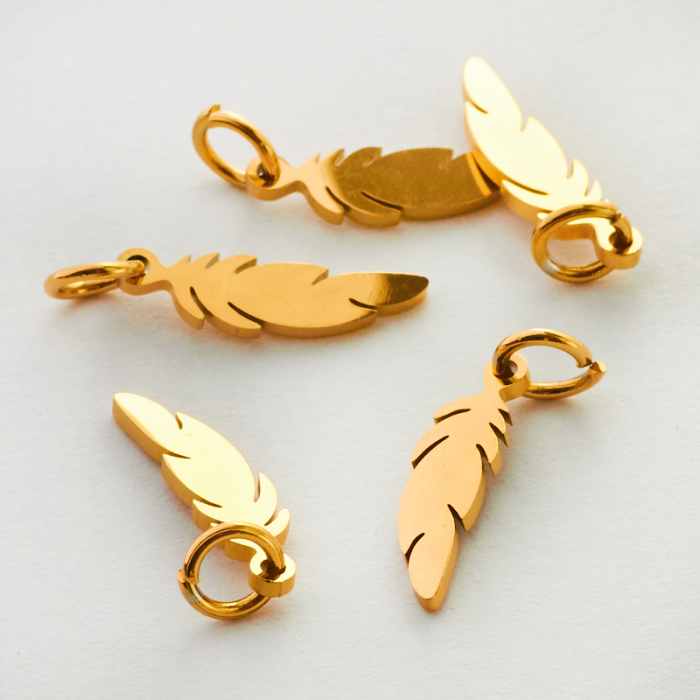 Zawieszka ze stali szlachetnej piórko w kolorze złotym 19,5mmTo dopracowany produkt ze stali szlachetnej, który łączy praktyczność z estetycznym wyglądem. Stal szlachetna to materiał ceniony za trwałość i estetyczny wygląd w codziennym użytkowaniu.W tym produkcie zastosowano stal szlachetną
