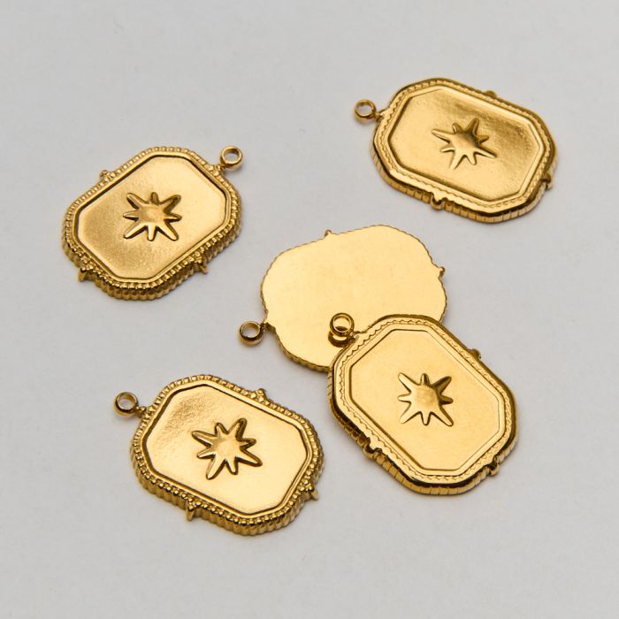 Zawieszka ze stali chirurgicznej róża wiatrów w prostokącie w kolorze złotym 22mm PVD