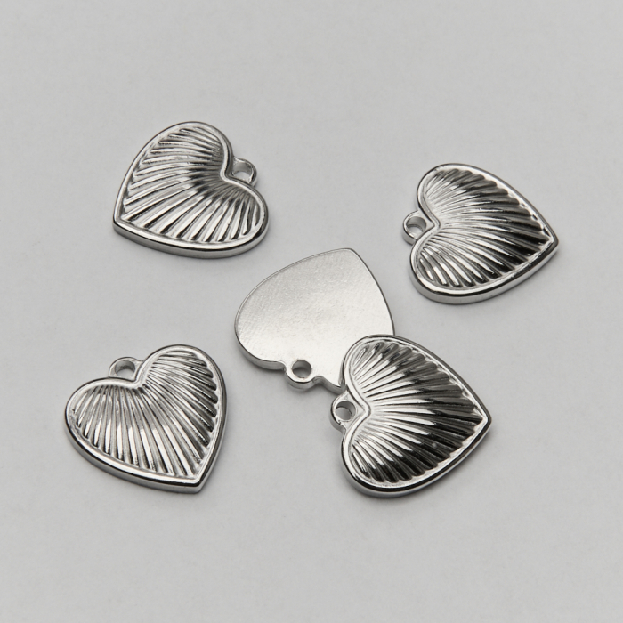 Zawieszka ze stali chirurgicznej serce w prążki w kolorze srebrnym 15mmTo starannie wykonany produkt ze stali chirurgicznej, który dobrze prezentuje się w codziennym użytkowaniu. To materiał chętnie wybierany do biżuterii handmade ze względu na trwałość, estetykę i wygodę użytkowania.Zawieszka ze stali chirurgicznej to dekoracyjny element, który nadaje biżuterii charakteru i pozwala tworzyć spersonalizowane projekty. Świetnie sprawdza się w naszyjnikach, bransoletkach, kolczykach oraz drobnych charmsach.Forma lub motyw