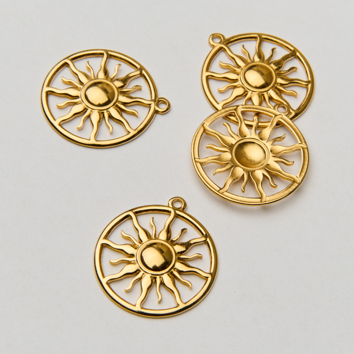 Zawieszka ze stali chirurgicznej słońce w kole w kolorze złotym 24mm PVDTo estetyczny element biżuteryjny ze stali chirurgicznej, chętnie wybierany do nowoczesnych projektów. W biżuterii handmade stal chirurgiczna jest ceniona za dobry wygląd, odporność na korozję i wygodę codziennego użytkowania. Wykończenie w kolorze złotym uzyskane metodą PVD.Zawieszka ze stali chirurgicznej to dekoracyjny element, który nadaje biżuterii charakteru i pozwala tworzyć spersonalizowane projekty. Świetnie sprawdza się w naszyjnikach, bransoletkach, kolczykach oraz drobnych charmsach.Forma lub motyw