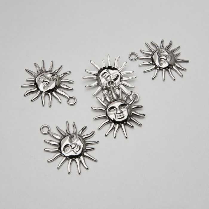 Zawieszka ze stali chirurgicznej słońce w kolorze srebrnym 25,5mmTo estetyczny element biżuteryjny ze stali chirurgicznej, chętnie wybierany do nowoczesnych projektów. Stal szlachetna dobrze sprawdza się w biżuterii noszonej na co dzień, ponieważ łączy trwałość z estetycznym wykończeniem.Zawieszka ze stali chirurgicznej to dekoracyjny element, który nadaje biżuterii charakteru i pozwala tworzyć spersonalizowane projekty. Świetnie sprawdza się w naszyjnikach, bransoletkach, kolczykach oraz drobnych charmsach.Forma lub motyw