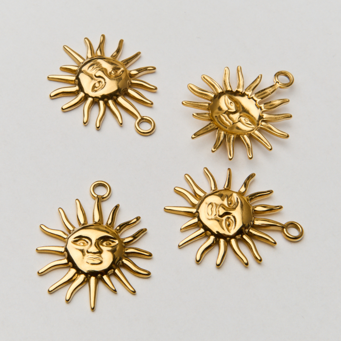 Zawieszka ze stali chirurgicznej słońce w kolorze złotym 25,5mm PVDTo starannie wykonany produkt ze stali chirurgicznej, który dobrze prezentuje się w codziennym użytkowaniu. W biżuterii handmade stal chirurgiczna jest ceniona za dobry wygląd, odporność na korozję i wygodę codziennego użytkowania. Wykończenie w kolorze złotym uzyskane metodą PVD.Zawieszka ze stali chirurgicznej to dekoracyjny element, który nadaje biżuterii charakteru i pozwala tworzyć spersonalizowane projekty. Świetnie sprawdza się w naszyjnikach, bransoletkach, kolczykach oraz drobnych charmsach.Forma lub motyw