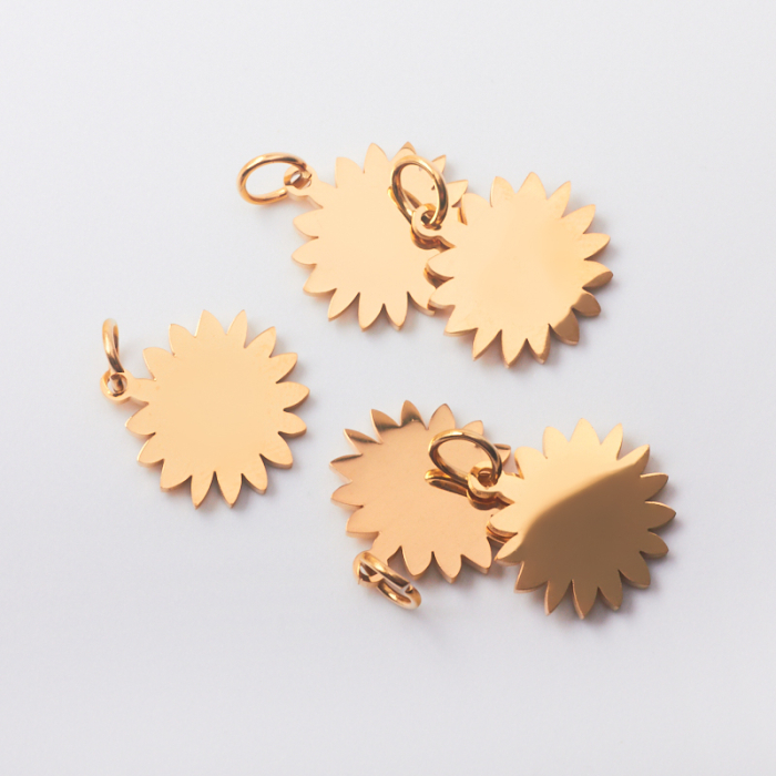 Zawieszka ze stali szlachetnej słoneczko w kolorze zlotym 15mmTo dopracowany produkt ze stali szlachetnej, który łączy praktyczność z estetycznym wyglądem. Stal szlachetna to materiał ceniony za trwałość i estetyczny wygląd w codziennym użytkowaniu.W tym produkcie zastosowano stal szlachetną
