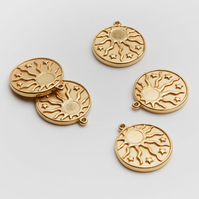 Zawieszka ze stali chirurgicznej słoneczko z promieniami w kółku w kolorze złotym 15mm PVD