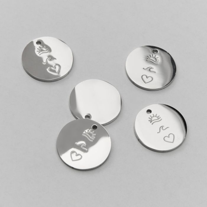 Zawieszka ze stali chirurgicznej z delikatnym grawerem słońca, fali i miłości w kolorze srebrnym 15mm