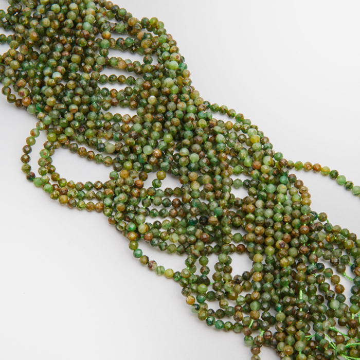 Kamienie naturalne wykonane z zielonego lapidolitu w kształcie kulki fasetowanej. Bazowy kolor kamieni to zielony, przemieszany z brązowym, pomarańczowym, czarnym, szarym. Kulki posiadają naturalnie powstałe przebarwienia oraz wrostki.*Ponieważ są to kamienie naturalne mogą się nieznacznie różnić od siebie rozmiarem i kolorem w zależności od partii produkcyjnej.*Rozmiar podany w nazwie produktu jest wartością orientacyjną. Charakterystyka: